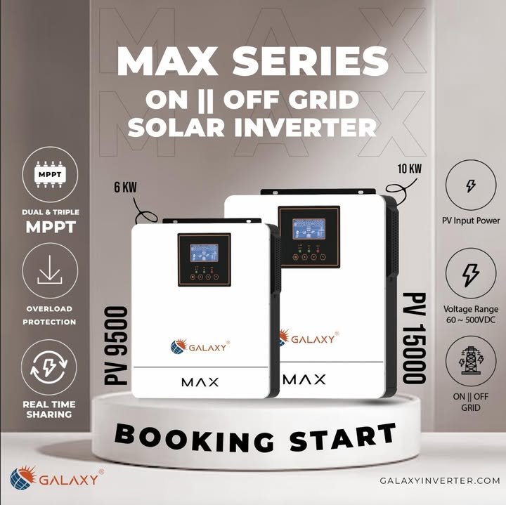 The Galaxy MAX Series is engineered for high-performance solar systems, delivering reliable power for both on-grid and off-grid applications. Available in 6KW (PV 9500) and 10KW (PV 15000) models, it’s built to handle heavy loads with maximum efficiency and safety. 🔋 Key Features: